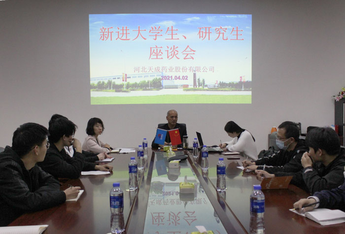 座谈会在轻松、愉悦的氛围中进行,来自不同地方、不同学府的40位青年大学生结合自身学习经历进行了简单的自我介绍。“击水三千已扬帆,鹏程万里正当时”,在听取新进大学生的发言后,颢总首先对大家加入天成药业表示热烈欢迎,并向大家讲述天成药业五十年的发展历程及企业的发展战略,让大家对企业有了更为深入的了解。颢总强调,药品关系到人类生命健康,他要求大家要有爱心、有责任心,要认真学习《药品管理法》,这体现出一个合格制药人的责任。
