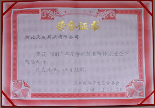 2014年荣获“2013年度争创著名商标先进企业”荣誉称号